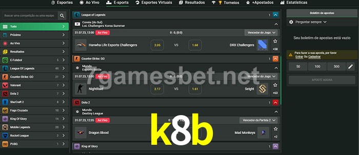 O k8b oferece uma grande seleção de opções de apostas em e-sports com probabilidades competitivas